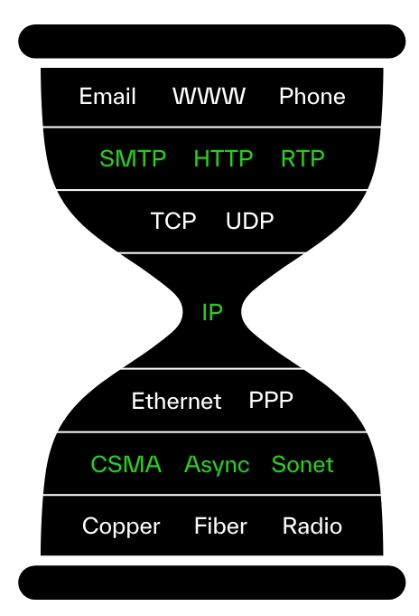 At the top, a broad range of application-layer protocols (such as HTTP, FTP, and SMTP) operate, while at the bottom, various network and link-layer protocols (such as Ethernet, Wi-Fi, and LTE) handle connectivity. The IP layer in the middle acts as a universal, minimal interface, ensuring seamless interoperability across diverse technologies and applications.