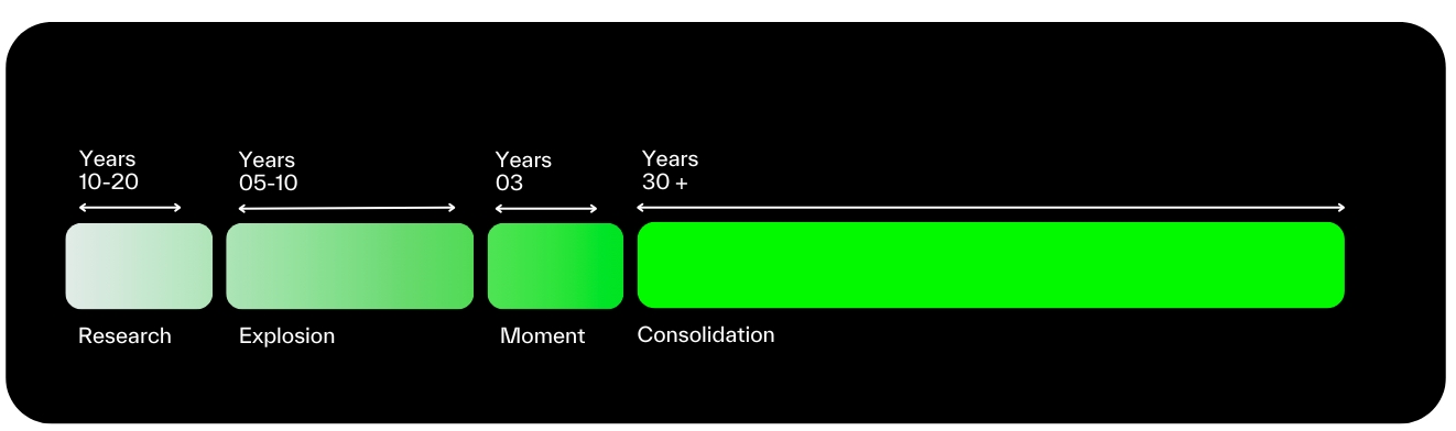 The Research Phase: This is where the technology begins in labs and research institutions, often with limited commercial viability. For personal computers, this phase occurred during the 1960s and early 1970s, when computing was primarily a tool for large enterprises and universities. For mobile phones, this phase spanned from the 1970s through the early 1990s, with basic mobile communication devices being developed and tested.